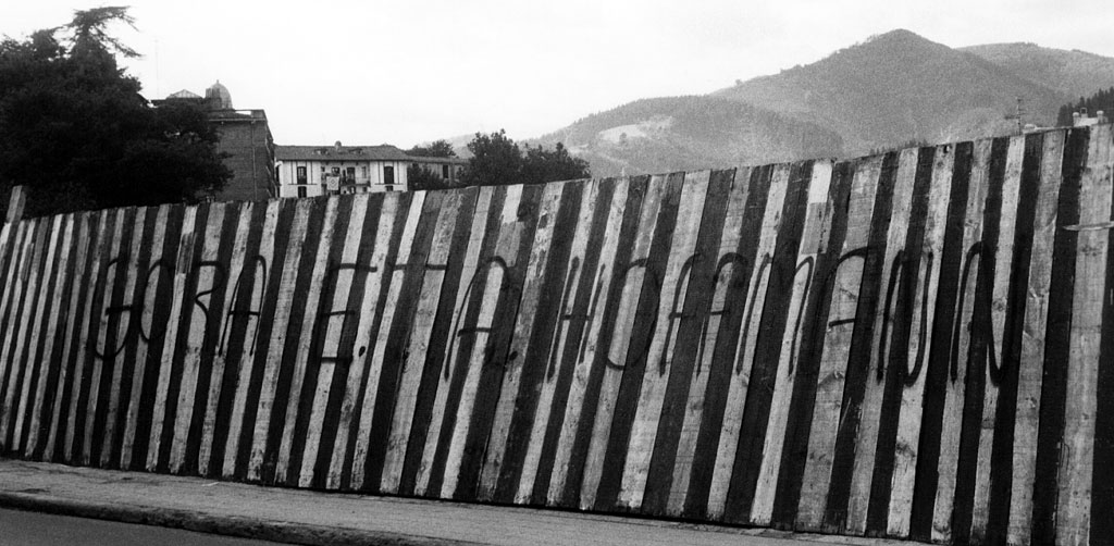 La frase - Gora E.T.A. - forma parte de mi imaginario, la he visto desde niño pintada en los lugares más inospechados, dudo que haya alguien que no sepa su significado. Un día, leyendo a E.T.A Hoffmann, sentí la necesidad de transformar la proclama de apoyo al terrorismo conviertiéndola en un grito poético. Pinté la frase GORA E.T.A HOFFMAN en una valla en el centro de mi ciudad. Posteriormente fotografié la valla. Muchos de mis trabajos los concluyo de forma gráfica, aquí realicé una edición de postales impresas a un color y barniz de tono turquesa. En la retiración decía: Tolosa, vista parcial.