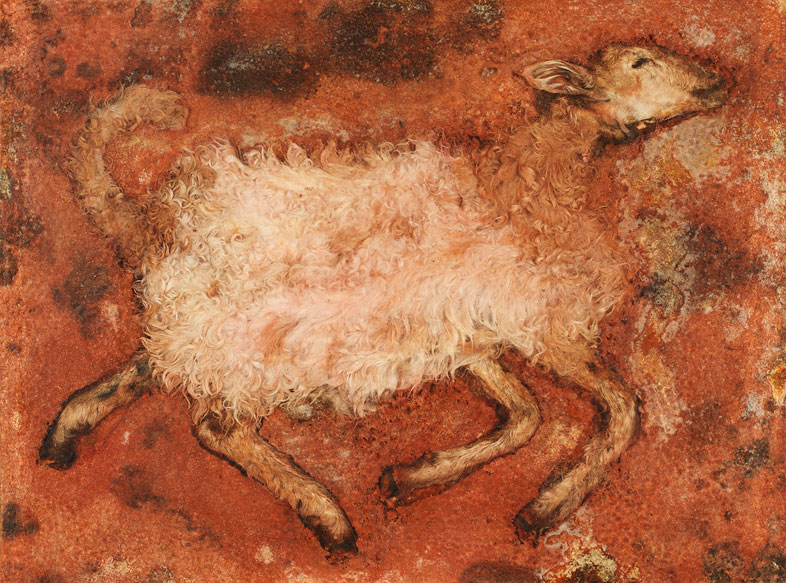 Junto a este vídeo se coloco una obra plástica de compleja factura. Formada por un cordero que murió atropellado por un automóvil. El simbolismo del cordero, la muerte indiscriminada de animales en las carreteras, la dificultad para que el espectador sepa distinguir si la obra es una pintura o un animal real, cargan de complejidad al trabajo.